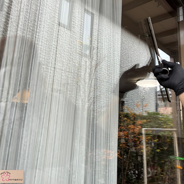 次はサッシ枠を大まかに磨いてから、外側からガラスを磨いて、拭き上げた後、表側のガラスを同じように仕上げます。